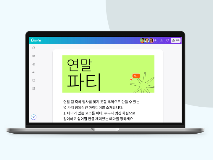 Canva(캔바) Docs에 대한 액세스 권한을 공유하여 친구 및 가족의 의견을 들어 보세요. 팀원들이 실시간으로 댓글을 달거나 편집하는 모습을 지켜보고 내가 Docs에 태그되면 알림을 받으세요.