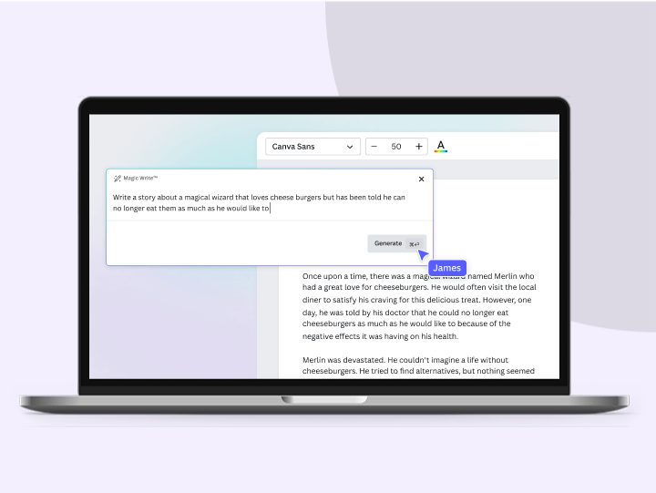 Canva의 맞춤형 /매직 키보드 단축키로 Magic Write를 사용하세요.