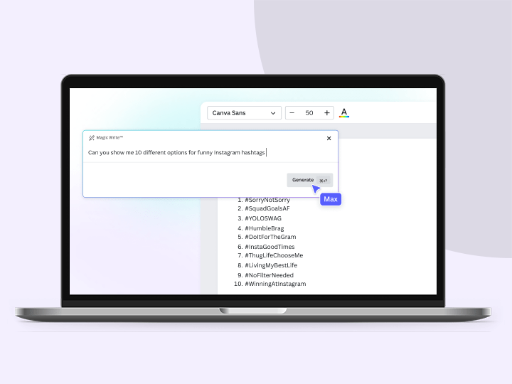 Magic Write에서 영감을 받은 멋진 이름으로 깊은 인상을 남깁시다. OpenAI로 구동되는 Canva의 이름 생성기는 다양한 상황에 맞는 작명 아이디어를 제공합니다. 영감을 얻고 수정한 후 최종 이름을 사용할 수 있는지 확인하여 사용하세요.